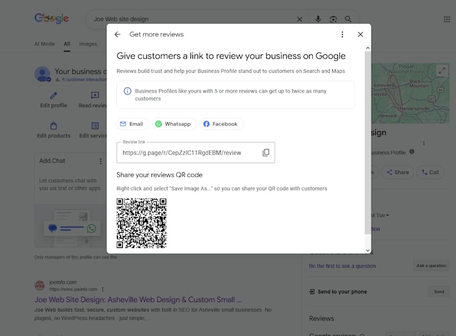 - Search your business name while logged into your Google Business Profile owner account. The exact steps for finding the links to your Google reviews (both 'read' and 'request') are outlined above in this post.